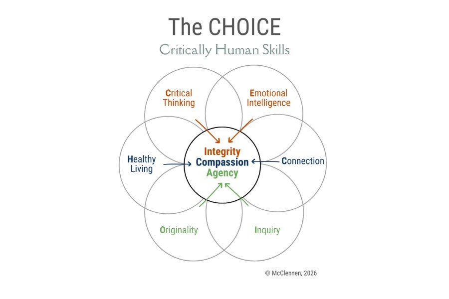 Рішення полягає у свідомому переході до «культури мети», де ШІ доповнює, а не замінює людські можливості. Це вимагає переосмислення освіти, наголошуючи на базовому наборі «Критичних людських навичок», об’єднаних у рамках CHOICE:
